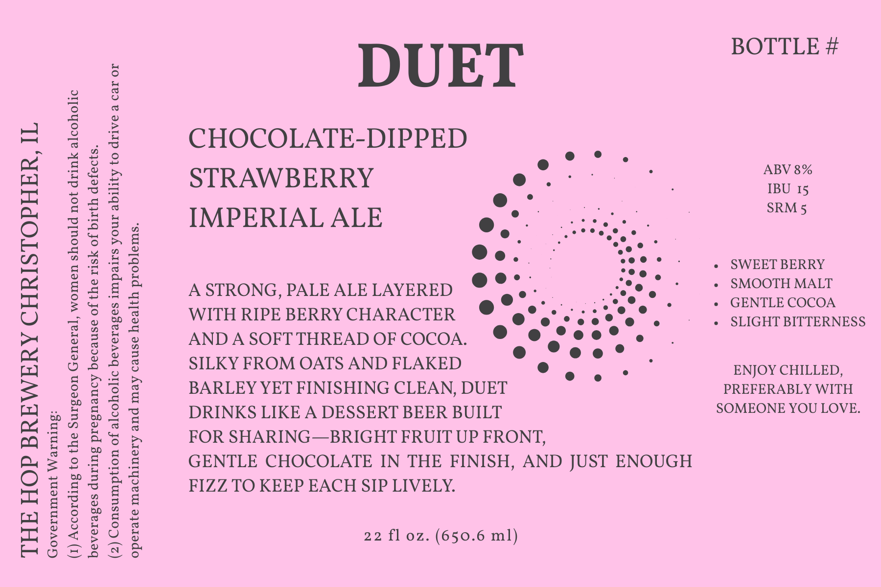 Chocolate Covered Strawberry Imperial Golden Ale — sweet berry on the nose and first sip, smooth malt through the mid-palate, gentle cocoa behind the fruit. Valentines Day Exclusive Release